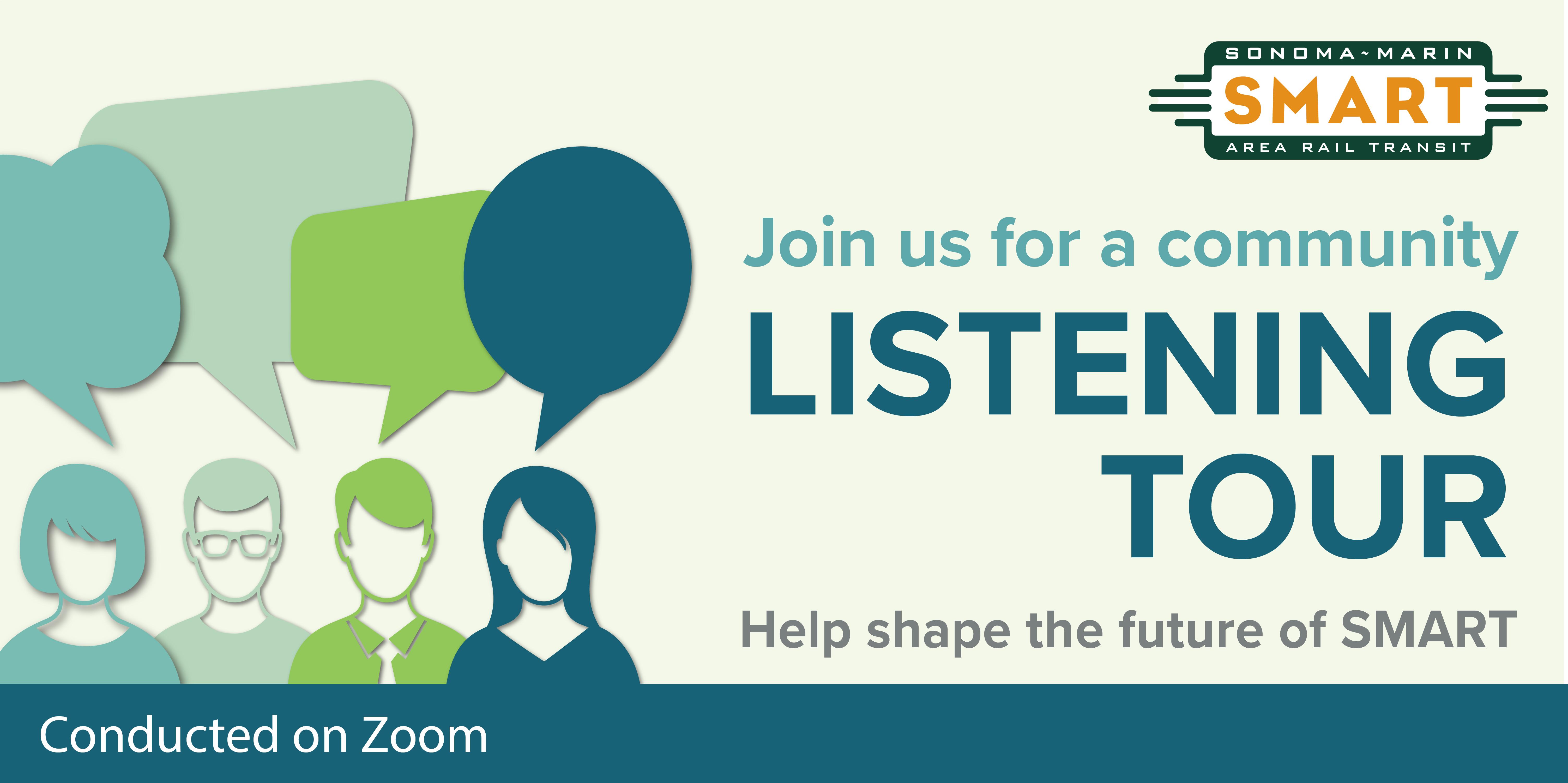 The Listening Forums will enable a dialogue where the SMART Board can hear from you and others, from all sectors of the broader North Bay community. Participants are encouraged to share their ideas and comments on any aspect of SMART. Your participation in these conversations will help shape the future of SMART, an integral part of the region’s economy as we recover from the COVID-19 health and economic crisis.