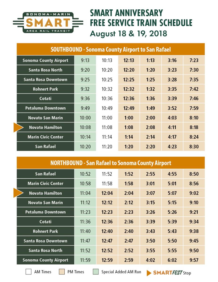 SMART is inviting the community to a celebration on Saturday, August 18 from 10 a.m. to 3 p.m. at the Novato Hamilton Station. The event includes live music, food trucks, North Bay businesses, and local beer and wine vendors. The event will also include free activities for children. As part of the celebration, SMART is also offering free train service on August 18 and 19, and increasing service with extra trips to get people to and from the festival.