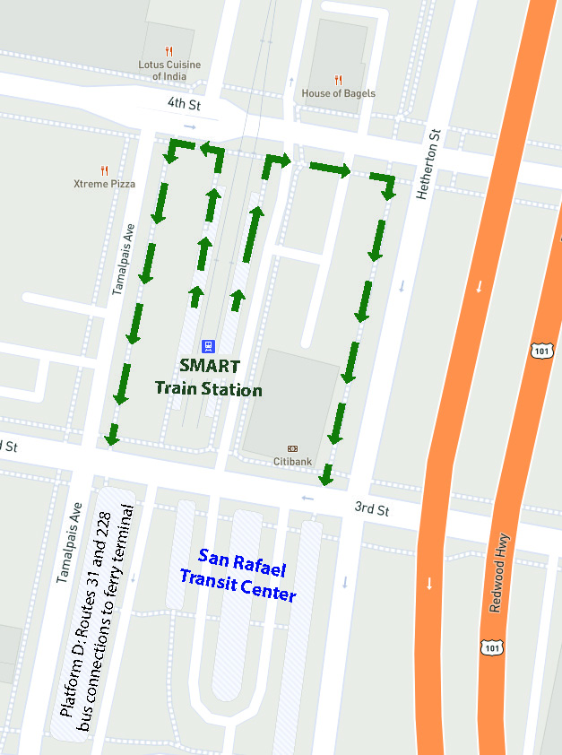 SMART passengers can access the San Rafael Transit center from Tamalpais Ave. or Hetherton St. Look for detour signage on the platform. SMART is coordinating with Golden Gate Transit and Ferry during the closure.