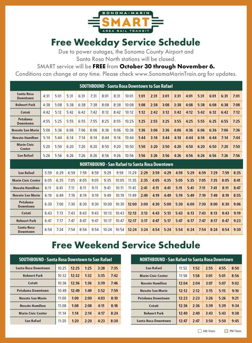 Update: SMART has resumed the full service schedule. Service will continue to be free through Wednesday, November 6. For details, visit http://SonomaMarinTrain.org/node/337. Sonoma-Marin Area Rail Transit (SMART) will operate on a limited schedule beginning Wednesday, October 30, as a result of extreme fire conditions in Sonoma and Marin counties.