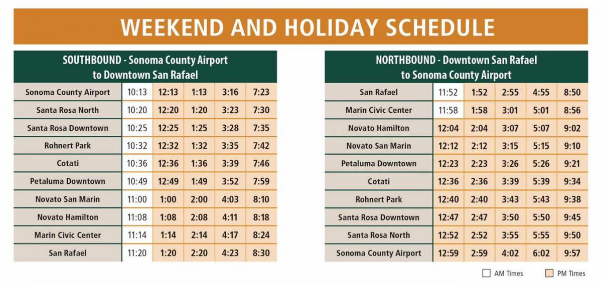 SMART will operate on its weekend/holiday schedule on Thursday, November 28, and Friday, November 29, with the first southbound train departing from the Sonoma County Airport station at 10:13 a.m., and the last northbound train departing the San Rafael Station at 8:50 p.m.
