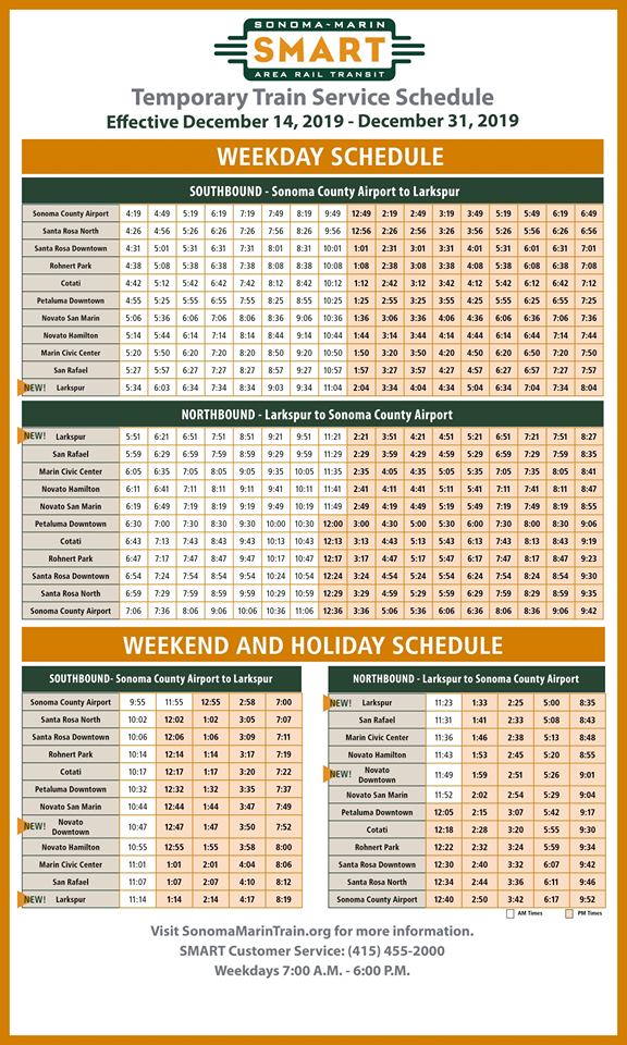 This schedule includes service to the new Larkspur station and weekend-only service to the Novato Downtown station. The temporary schedule will allow riders to take advantage of the new expanded train service for trips to and from the San Francisco Bay for commuting, holiday shopping and recreation.