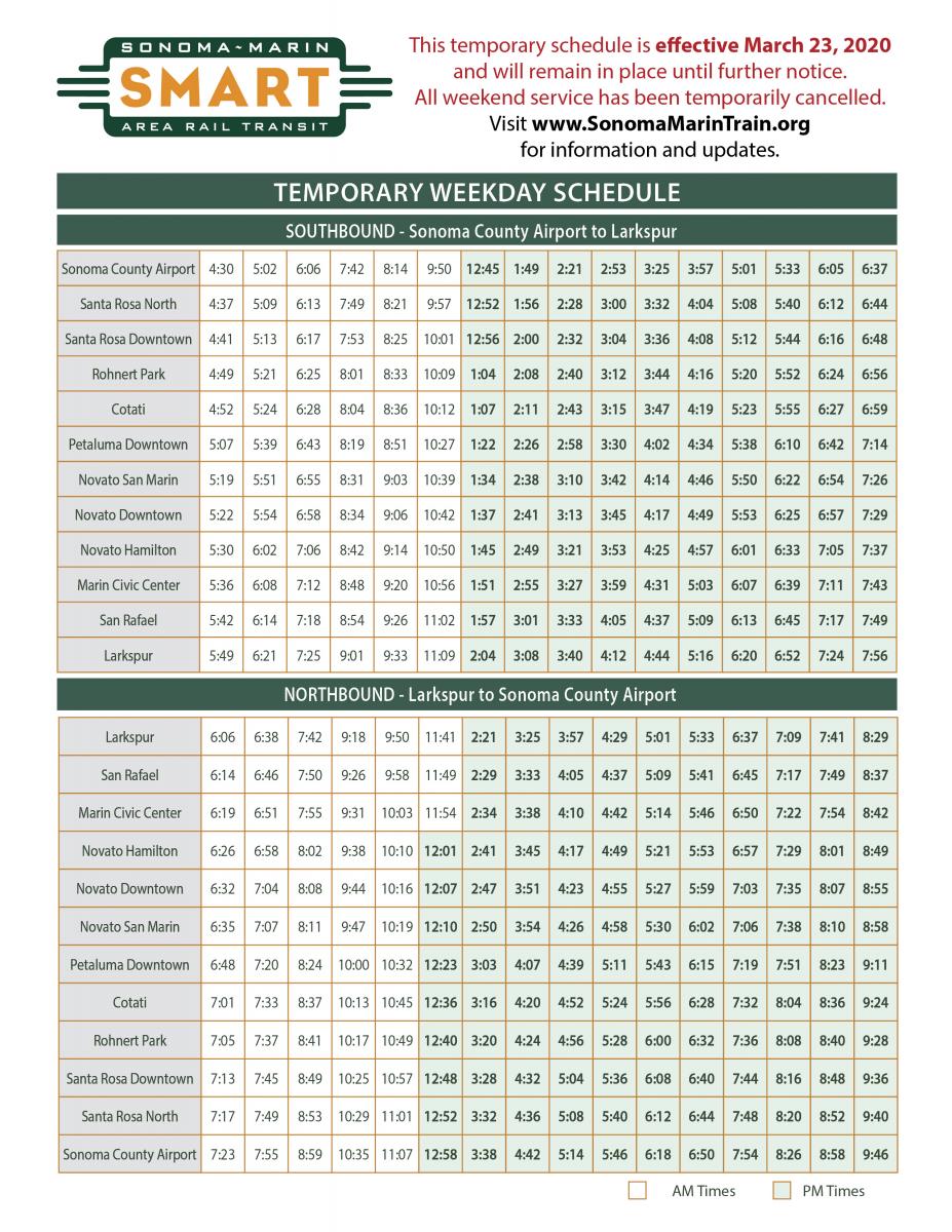 SMART is committed to serving riders who rely on public transit to conduct essential business and access vital resources such as healthcare, pharmacies and grocery stores. SMART will continue to provide train service and will make schedule adjustments as necessary in order to respond to ridership patterns and demand. You can find the current train schedule online at SonomaMarinTrain.org/schedules-fares, and a printable temporary schedule.