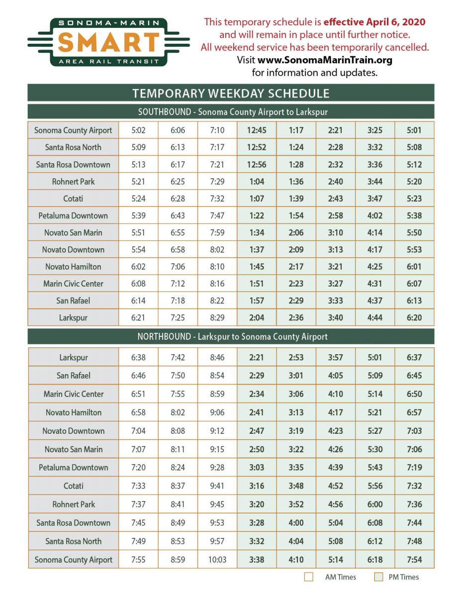 Under the modified schedule, some train departure times have been changed in order to provide adequate coverage for mid-day travelers. Riders are advised to check the online schedule at https://sonomamarintrain.org/schedules-fares before starting a trip. A printable PDF version of the modified schedule is also available online. Other transit agencies have modified their service schedule as well—visit 511.org for updates about other transit services.