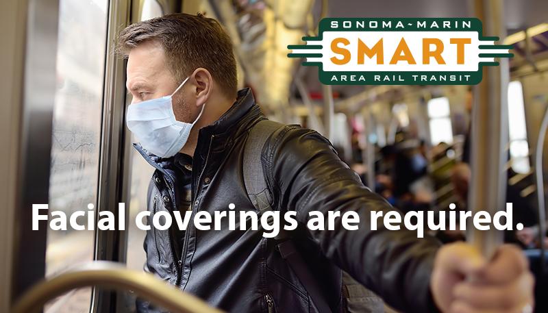 Passengers are required to wear a facial covering while on board SMART trains and at station platforms, per local public health orders for Marin and Sonoma counties, and guidance from the Centers for Disease Control (CDC).